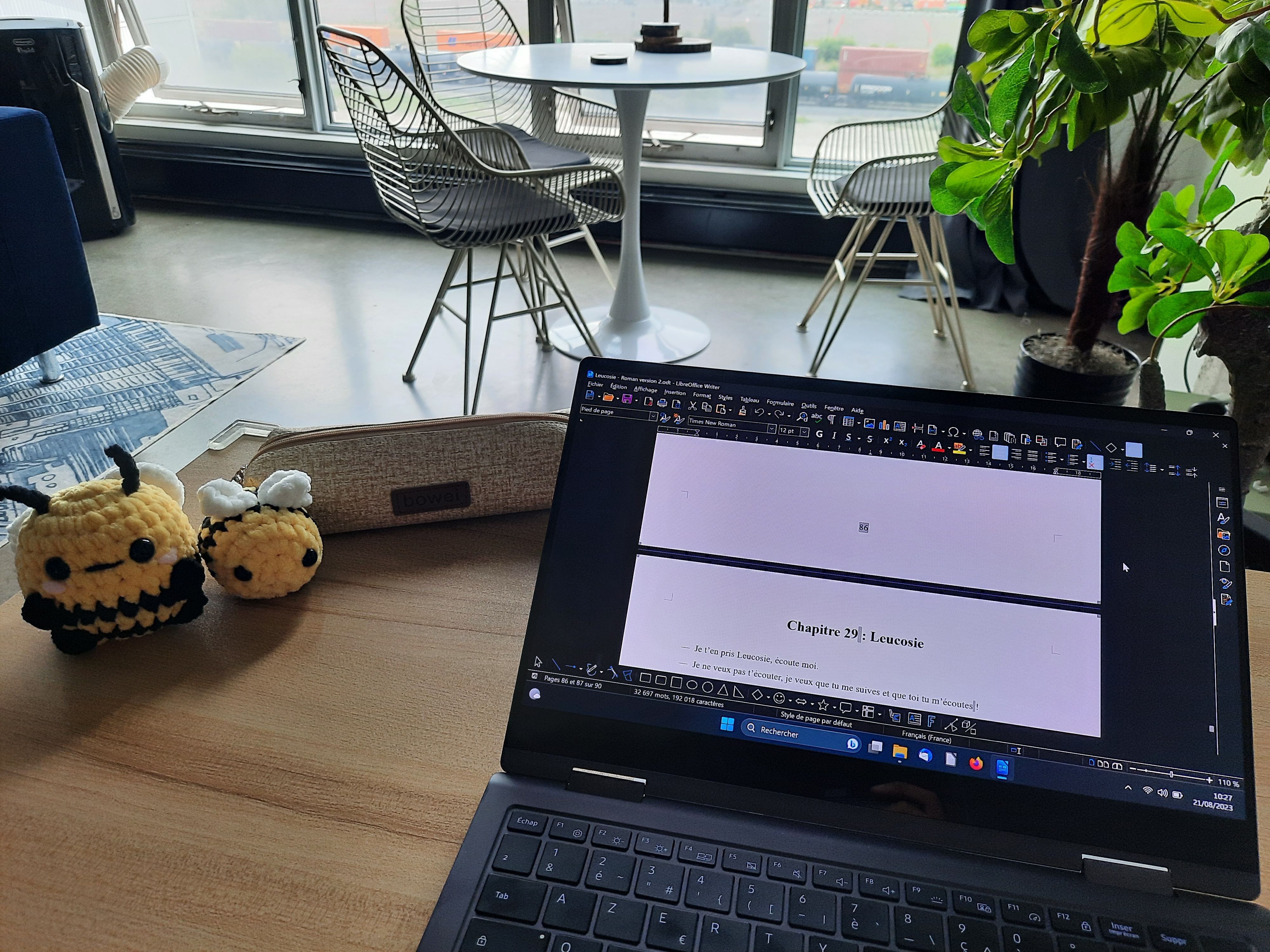 Aujourd’hui, donc le 21 août 2023, j’ai commencé la dernière partie de mon roman Leucosie. Comment dire. Waouh ! Et… je me sens assez bizarre. J’ai réussi à écrire les chapitres 29 et 30, ainsi qu’une partie d’un autre qui se trouve plus loin (oui, le texte est venu tout seul, donc bien sûr, j’ai dû l’écrire ^^).
