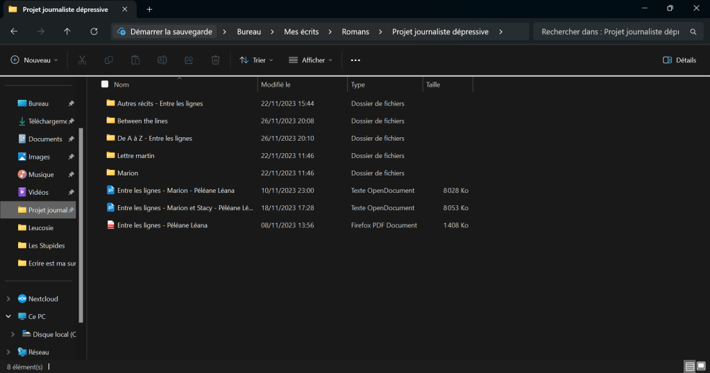 J’ai des idées d’extra-minis nouvelles sur ce sujet qui est si fort et qui donne matière à travailler. J’ai donc 2 récits de plus, qui pourraient s’intégrer dans un recueil de nouvelles avec la première histoire. Mais je rechigne à le faire car même si je les aime beaucoup, aucun n’est à la hauteur du tout premier, celui de Marion, qui se suffit largement à lui seul. Donc je ne sais pas trop quoi faire pour l’instant.