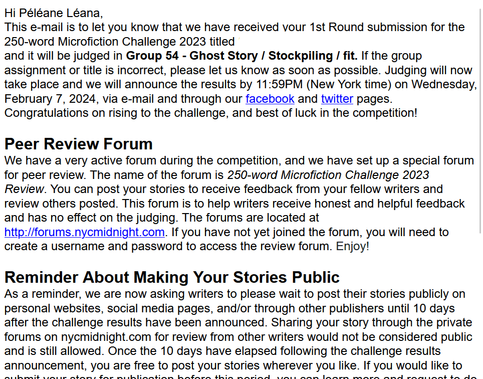 That’s it! I received the first email from the judges officially confirming that my microfiction has arrived in their hands, that it is accepted for the rest of the competition and that I have not gone off-topic! I am very happy!